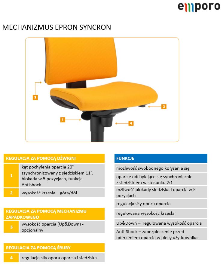 - umożliwia zsynchronizowane i dynamiczne pochylenie regulowanego na wysokość oparcia i siedziska w stosunku 2:1 z możliwością nastawiania siły nacisku i unieruchomienia w różnych pozycjach